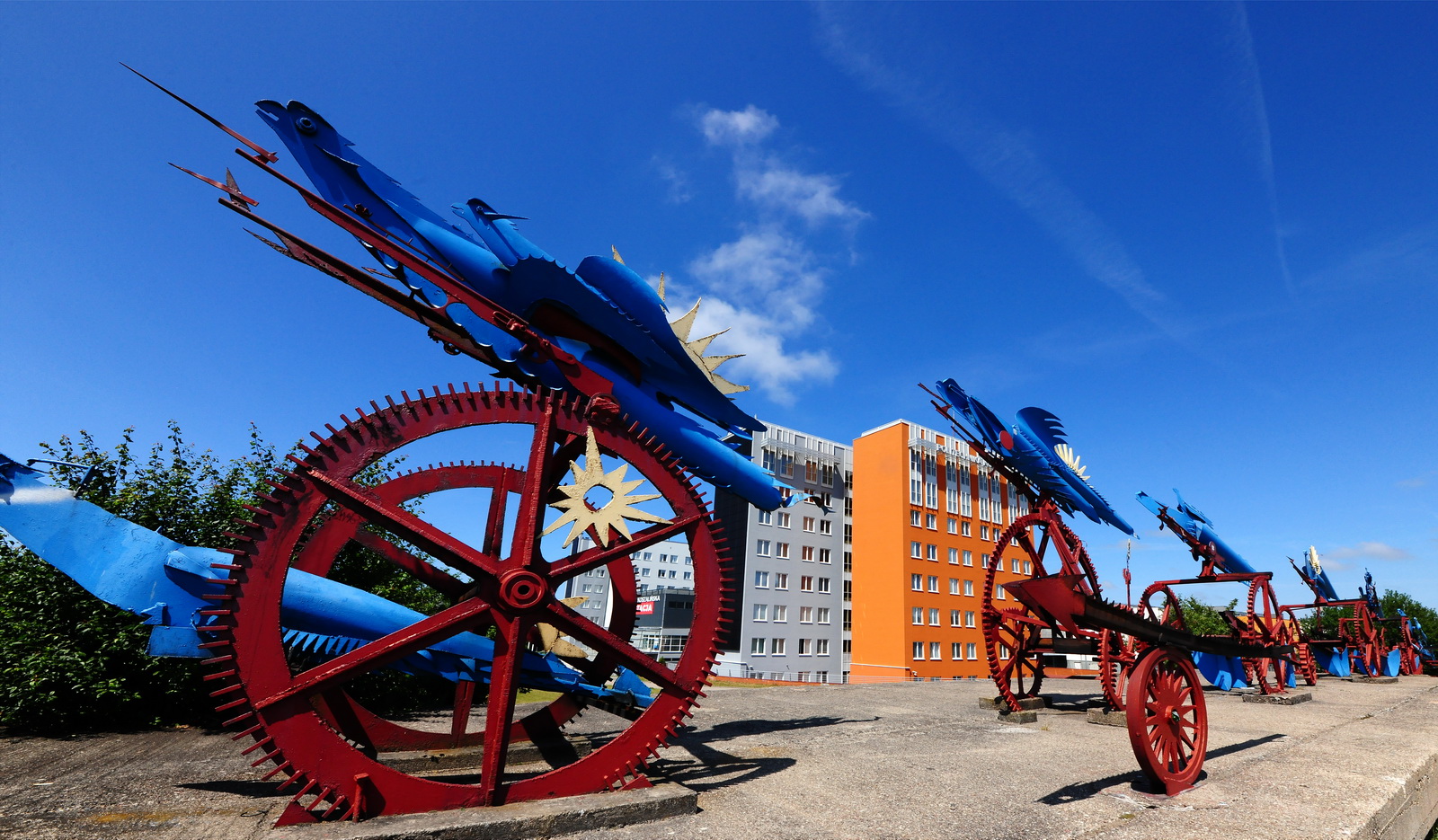 To jeden z wartościowych i ciekawszych obiektów artystycznych w mieście. Instalacja składająca się z 24 stalowych ptaków powstała w latach 1977-1978 w pracowni Władysława Hasiora, awangardowego, podhalańskiego artysty i rzeźbiarza. Pomnik, dziś zwany w skrócie „Ptakami”, powstał dla upamiętnienia wysiłku polskiego żołnierza zdobywającego w 1945 r. Pomorze i formalnie nosił nazwę „Tym, co walczyli o polskość i wolność ziem Pomorza”. Początkowo wykonane z metalu konstrukcje były szaro-rdzawe. Licząca 80 m długości konstrukcja, ustawiona jest na sztucznie wykonanym wzniesieniu górującym nad okolicą około 6 m. Stalowe ptaki to przestrzenne wyobrażenie orłów siedzących na bojowych rydwanach, za którymi ciągnięte są wieloskibowe pługi. Całą konstrukcję łączą dodatkowo strzały, sugerujące płomienne pociski. Ptaki, przy okazji ważnych uroczystości, happeningów i imprez, płoną żywym ogniem (instalacja podłączona jest do sieci gazowej). Źródło: Archiwum UM w Koszalinie